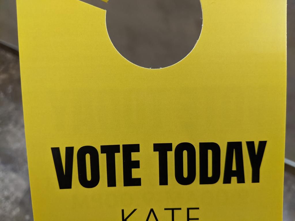 (Image description: A close-up of a yellow door hanger with the text "VOTE TODAY / Kate". The rest of the text is not visible.)